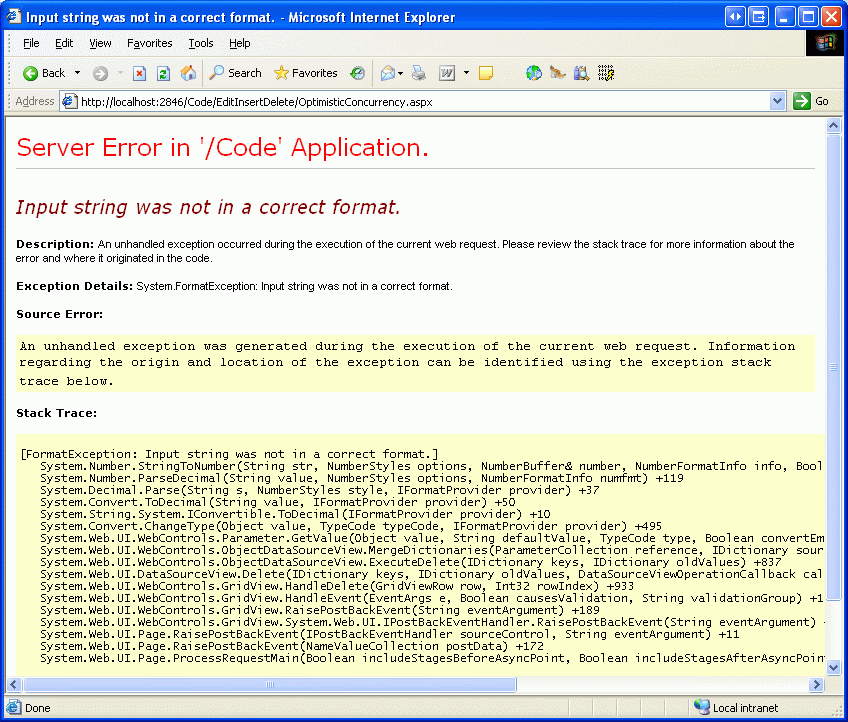 Nachdem Sie dieses Problem behoben haben, versuchen Sie erneut, auf die Schaltfläche "Löschen" für ein beliebiges Produkt zu klicken. Dieses Mal erhalten Sie eine InvalidOperationException , wenn die ObjectDataSource versucht, die BLL-Methode UpdateProduct aufzurufen.