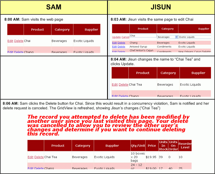 Aus Sicht des Endbenutzers hat das Klicken auf die Schaltfläche "Löschen" für "Chai Tea" im zweiten Browserfenster dazu geführt, dass der Bildschirm blinkt und das Produkt nach der Rückkehr noch vorhanden ist, obwohl es jetzt als "Chai" aufgeführt ist (die Änderung des Produktnamens, die von der ersten Browserinstanz vorgenommen wurde). Wenn der Benutzer erneut auf die Schaltfläche "Löschen" klickt, wird der Löschvorgang erfolgreich abgeschlossen, da der ursprüngliche GridView-Wert ("Chai") nun mit dem Wert in der Datenbank übereinstimmt.