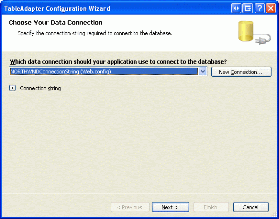 Um ein neues Typed DataSet zu erstellen, klicken Sie mit der rechten Maustaste auf den DAL Ordner innerhalb des App_Code Ordners, und fügen Sie ein neues DataSet mit dem Namen hinzu NorthwindOptimisticConcurrency. Wie wir im ersten Tutorial gesehen haben, wird dadurch ein neuer TableAdapter zum typisierten DataSet hinzugefügt, und der TableAdapter Konfigurationsassistent wird automatisch gestartet. Im ersten Bildschirm werden wir aufgefordert, die Datenbank anzugeben, mit der eine Verbindung hergestellt werden soll – eine Verbindung mit derselben Northwind-Datenbank mithilfe der NORTHWNDConnectionString Einstellung von Web.config.