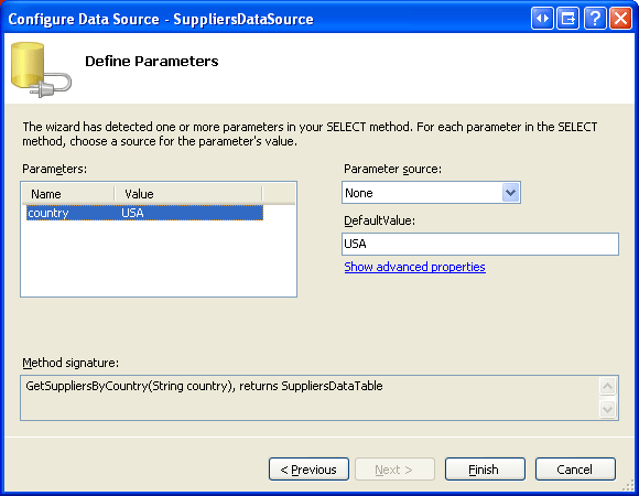 Da die GetSuppliersByCountry(country) Methode einen Parameter akzeptiert, fordert der Assistent "Datenquelle konfigurieren" uns zur Quelle dieses Parameters auf. Wenn Sie einen hartcodierten Wert ( USA, in diesem Beispiel) angeben möchten, lassen Sie die Dropdownliste "Parameterquelle" auf "None" festgelegt, und geben Sie den Standardwert in das Textfeld ein. Klicken Sie auf Fertig stellen, um den Assistenten abzuschließen.