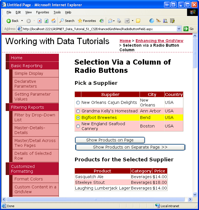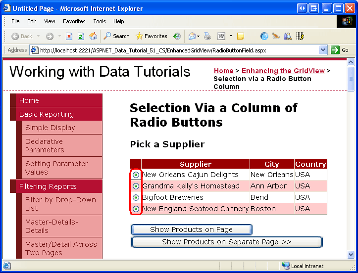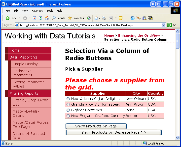Dieser Code funktioniert einwandfrei, solange eines der Optionsfelder aus der GridView ausgewählt ist. Wenn die GridView anfänglich keine Optionsfelder ausgewählt hat und der Benutzer auf die SendToProducts Schaltfläche klickt, wird SuppliersSelectedIndex-1, was dazu führt, dass eine Ausnahme ausgelöst wird, da -1 außerhalb des Indexbereichs der DataKeys Auflistung liegt. Dies ist jedoch kein Problem, wenn Sie sich entschieden haben, den RowCreated Ereignishandler zu aktualisieren, wie in Schritt 3 beschrieben, damit das erste Optionsfeld in der GridView standardmäßig ausgewählt ist.