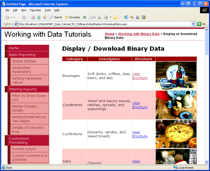 In diesem Lernprogramm haben wir untersucht, wie Binärdaten dargestellt werden. Die Darstellung der Daten hängt vom Datentyp ab. Für die PDF-Broschürendateien haben wir dem Benutzer einen Link "Broschüre anzeigen" angeboten, über den der Benutzer beim Klicken direkt zur PDF-Datei gelangt ist. Für das Bild der Kategorie haben wir zuerst eine Seite erstellt, um die Binärdaten aus der Datenbank abzurufen und zurückzugeben und diese Seite dann verwendet, um jedes Kategoriebild in einer GridView anzuzeigen.