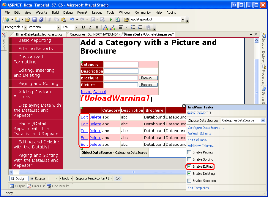 Im vorherigen Lernprogramm haben wir eine Seite mit dem Namen UploadInDetailsView.aspx erstellt, die alle Kategorien in einer GridView aufgelistet und eine DetailsView bereitgestellt hat, um dem System neue Kategorien hinzuzufügen. In diesem Lernprogramm erweitern wir die GridView so, dass die Bearbeitungs- und Löschunterstützung eingeschlossen wird. Anstatt weiter zu arbeiten, UploadInDetailsView.aspx wollen wir stattdessen die Änderungen dieses Tutorials auf der UpdatingAndDeleting.aspx Seite aus demselben Ordner platzieren. ~/BinaryData Kopieren Sie das deklarative Markup und den Code von UploadInDetailsView.aspx bis UpdatingAndDeleting.aspx.