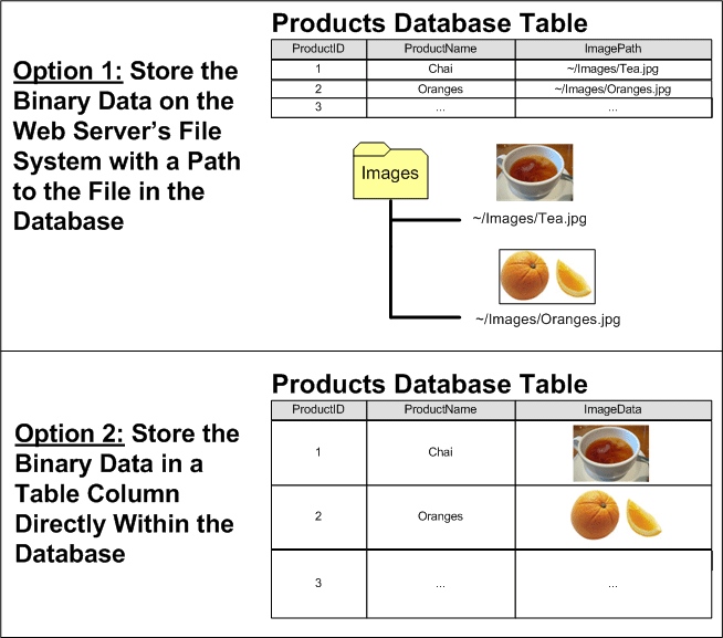 Stellen Sie sich vor, dass wir die Northwind-Datenbank erweitern wollten, um jedem Produkt ein Bild zuzuordnen. Eine Möglichkeit wäre, diese Bilddateien im Dateisystem des Webservers zu speichern und den Pfad in der Products Tabelle aufzuzeichnen. Mit diesem Ansatz fügen wir vielleicht eine ImagePath Spalte zur Products Tabelle vom Typ varchar(200)hinzu. Wenn ein Benutzer ein Bild für Chai hochgeladen hat, wird dieses Bild möglicherweise im Dateisystem des Webservers unter " gespeichert, wobei ~/Images/Tea.jpg~ der physische Pfad der Anwendung dargestellt wird. Das heißt, wenn die Website auf dem physischen Pfad C:\Websites\Northwind\verwurzelt ist, ~/Images/Tea.jpg würde gleichbedeutend mit C:\Websites\Northwind\Images\Tea.jpg. Nach dem Hochladen der Bilddatei aktualisieren wir den Chai-Eintrag in der Products Tabelle so, dass die ImagePath Spalte auf den Pfad des neuen Bilds verweist. Wir könnten es verwenden ~/Images/Tea.jpg oder einfach nur Tea.jpg , wenn wir entschieden haben, dass alle Produktbilder in den Ordner der Images Anwendung eingefügt werden.