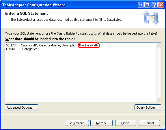Mit diesen beiden DataColumn Hinzugefügten, CategoriesDataTablewir sind bereit, die CategoriesTableAdapter. In der TableAdapter-Hauptabfrage konnten beide Spaltenwerte zurückgegeben werden, dies würde jedoch bei jedem Aufruf der GetCategories() Methode die Binärdaten zurückgeben. Stattdessen aktualisieren wir die Hauptabfrage "TableAdapter", um BrochurePath eine zusätzliche Datenabrufmethode zu erstellen, die eine bestimmte Kategoriespalte Picture zurückgibt.