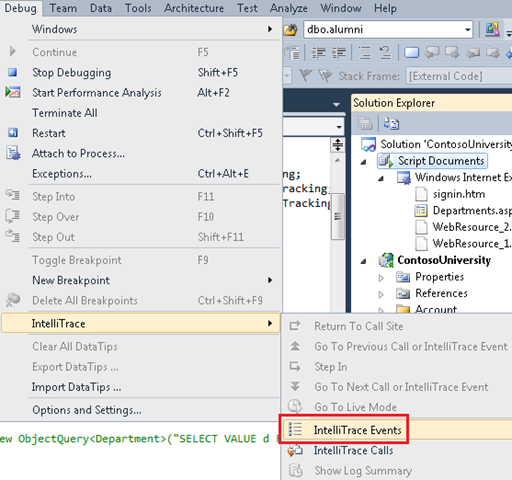 Führen Sie die Seite Departments.aspx im Debugger aus, und überprüfen Sie das IntelliTrace-Fenster wie zuvor erneut. Jetzt, wo es zuvor eine einzelne Abfrage gab, sehen Sie eine lange Sequenz von ihnen.
