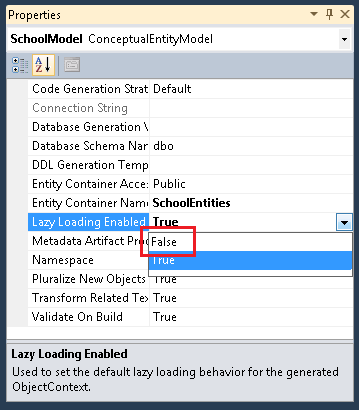 Öffnen Sie das Datenmodell SchoolModel.edmx , klicken Sie auf die Entwurfsoberfläche, und legen Sie dann im Eigenschaftenbereich die Eigenschaft Lazy Loading Enabled auf fest False. Speichern und schließen Sie das Datenmodell.