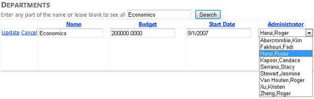Führen Sie die Seite Departments.aspx aus , um zu überprüfen, ob sie wie zuvor funktioniert. Die GetInstructorNames -Methode wird aufgerufen, um die Dropdownliste des Administrators aufzufüllen, und die GetDepartmentsByAdministrator Methode wird aufgerufen, wenn Sie auf Aktualisieren klicken, um zu überprüfen, ob kein Dozent ein Administrator mehrerer Abteilungen ist.