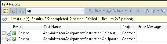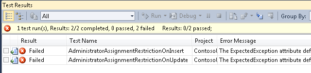 Die Testmethoden überprüfen, ob die Business Logic-Klasse eine Ausnahme auslöst, wenn jemand versucht, eine neue Abteilung mit demselben Administrator wie eine vorhandene Abteilung einzufügen, oder wenn jemand versucht, den Administrator einer Abteilung zu aktualisieren, indem er sie auf die ID einer Person festlegt, die bereits Administrator einer anderen Abteilung ist.