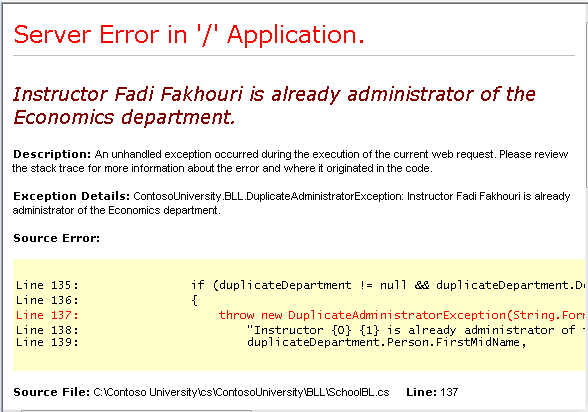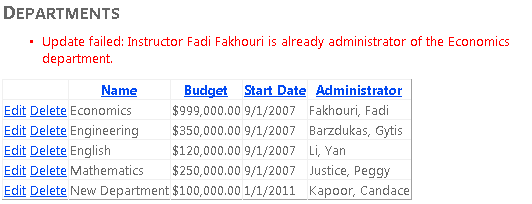 Als Nächstes implementieren Sie die Geschäftslogik, die es unmöglich macht, als Administrator einer Abteilung jemanden festzulegen, der bereits Administrator einer anderen Abteilung ist. Sie lösen eine Ausnahme aus der Geschäftslogikebene aus und erfassen sie dann in der Präsentationsebene, wenn ein Benutzer eine Abteilung bearbeitet und auf Aktualisieren klickt, nachdem er jemanden ausgewählt hat, der bereits Administrator ist. (Sie können auch Kursleiter aus der Dropdownliste entfernen, die bereits Administratoren sind, bevor Sie die Seite rendern, aber der Zweck besteht darin, mit der Geschäftslogikebene zu arbeiten.)