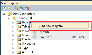Erweitern Sie unter Server Explorerdie Option Datenverbindungen, erweitern Sie School.mdf, klicken Sie mit der rechten Maustaste auf Datenbankdiagramme, und wählen Sie Neues Diagramm hinzufügen aus.
