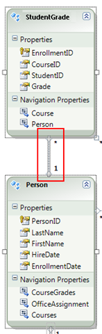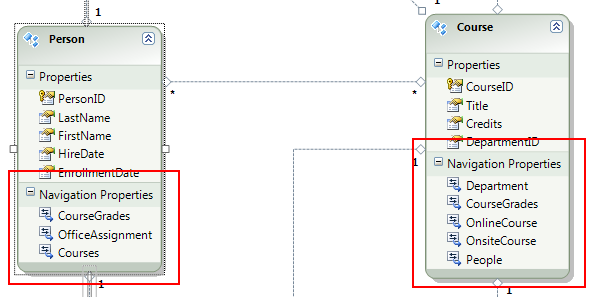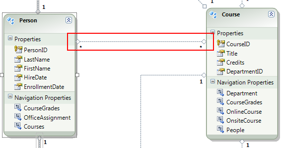 Ein weiterer Unterschied zwischen der Datenbank und dem Datenmodell ist das Fehlen der CourseInstructor Zuordnungstabelle, die in der Datenbank verwendet wird, um die Person Tabellen und Course in einer Viel-zu-Viele-Beziehung zu verknüpfen. Mit den Navigationseigenschaften können Sie verwandte Course Entitäten aus der Person Entität und verwandte Person Entitäten aus der Course Entität abrufen, sodass die Zuordnungstabelle im Datenmodell nicht dargestellt werden muss.