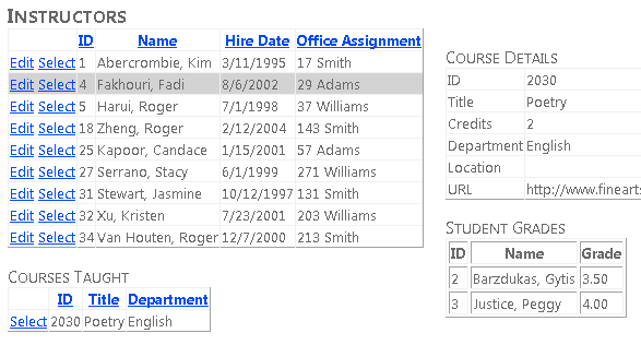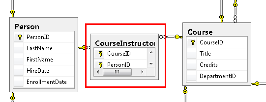 PersonEntität über zugeordneteCourseEntitäten verfügen oder nicht, und das Gegenteil ist auch richtig: EineCourseEntität kann zugeordnetePersonEntitäten aufweisen oder nicht. Mit anderen Worten, ein Kursleiter kann mehrere Kurse unterrichten, und ein Kurs kann von mehreren Kursleitern unterrichtet werden. (In dieser Datenbank gilt diese Beziehung nur für Kursleiter; sie verknüpft keine Kursteilnehmer. Die Kursteilnehmer werden in der Tabelle StudentGrades mit Kursen verknüpft.)