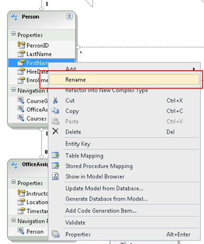 Klicken Sie im Designer mit der rechten Maustaste in der Person Entität auf Vorname, und wählen Sie dann Umbenennen aus.