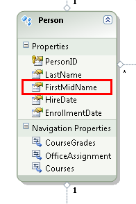 Nehmen Sie für dieses Tutorial an, dass die FirstName Spalte der Person Tabelle tatsächlich sowohl den Vornamen als auch den zweiten Namen einer Person enthält. Sie möchten den Namen des Felds ändern, um dies widerzuspiegeln, aber der Datenbankadministrator (DBA) möchte die Datenbank möglicherweise nicht ändern. Sie können den Namen der FirstName Eigenschaft im Datenmodell ändern, während ihr Datenbankäquivalent unverändert bleibt.