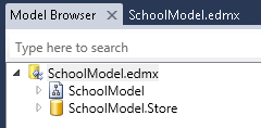 Im Bereich Modellbrowser wird eine Strukturansicht angezeigt. (Der Bereich Modellbrowser ist möglicherweise mit dem bereich Projektmappen-Explorer angedockt.) Der Knoten SchoolModel stellt die Datenmodellstruktur dar, und der SchoolModel.Store Knoten stellt die Datenbankstruktur dar.
