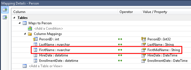 Dadurch wird das Fenster Zuordnungsdetails geöffnet. Beachten Sie, dass in diesem Fenster angezeigt wird, dass die Datenbankspalte FirstNameFirstMidNamezugeordnet ist, in die Sie sie im Datenmodell umbenannt haben.
