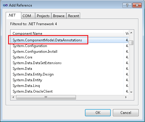 Klicken Sie in Projektmappen-Explorer mit der rechten Maustaste auf das Projekt ContosoUniversity, wählen Sie "Verweis hinzufügen" aus, und fügen Sie einen Verweis hinzuSystem.ComponentModel.DataAnnotations.