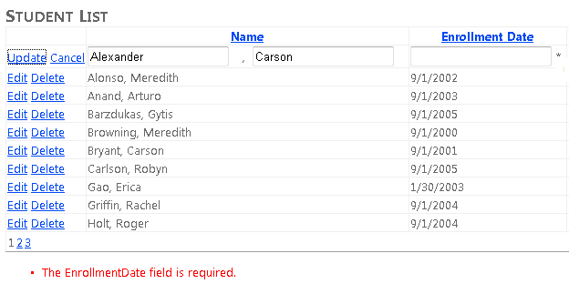 Bearbeiten Sie eine Zeile, und versuchen Sie, die Werte in den Namensfeldern zu löschen. Das Sternchen, das angibt, dass Feldfehler angezeigt werden, sobald Sie ein Feld verlassen, bevor Sie auf "Aktualisieren" klicken. Wenn Sie auf "Aktualisieren" klicken, zeigt die Seite den von Ihnen angegebenen Fehlermeldungstext an.