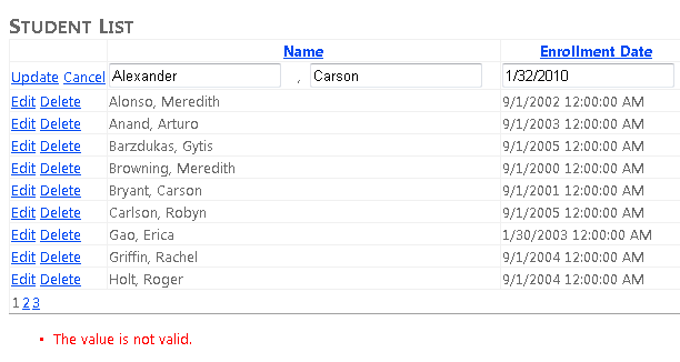 Um zu sehen, wie dies funktioniert, ändern Sie die Steuerelemente, die Sie zum Anzeigen und Bearbeiten von Feldern auf der vorhandenen Students.aspx Seite verwenden, und Sie fügen den Namen- und Datumsfeldern des Student Entitätstyps Formatierungs- und Validierungsmetadaten hinzu.