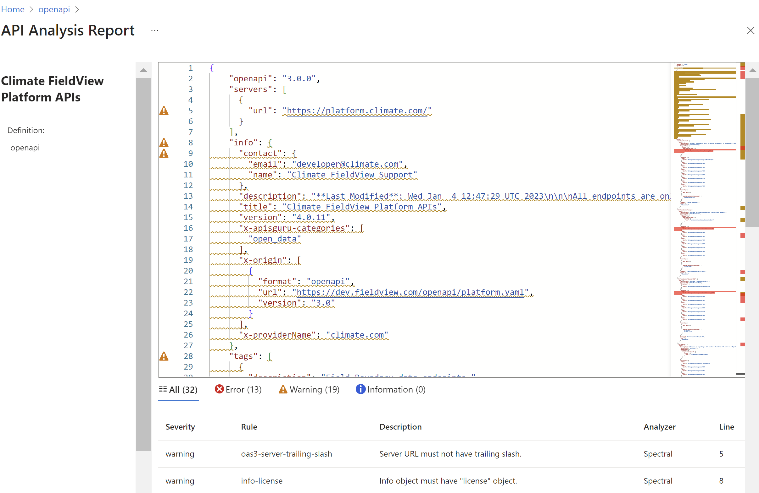 Sie können den Analysebericht für Ihre API-Definition im Azure-Portal anzeigen. Nachdem eine API-Definition analysiert wurde, listet der Bericht Fehler, Warnungen und Informationen basierend auf dem konfigurierten API-Stilleitfaden auf.
