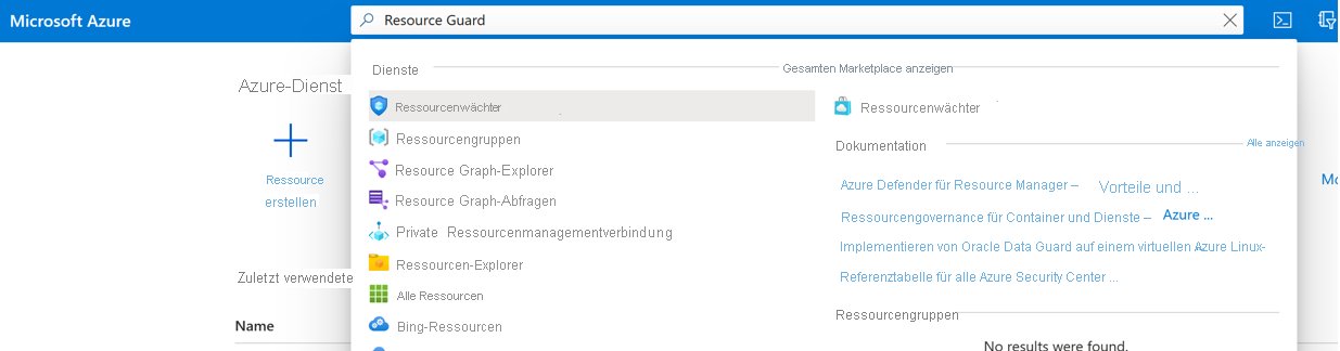 Suchen Sie in der Suchleiste nach Resource Guards, und wählen Sie in der Dropdownliste den entsprechenden Eintrag aus.