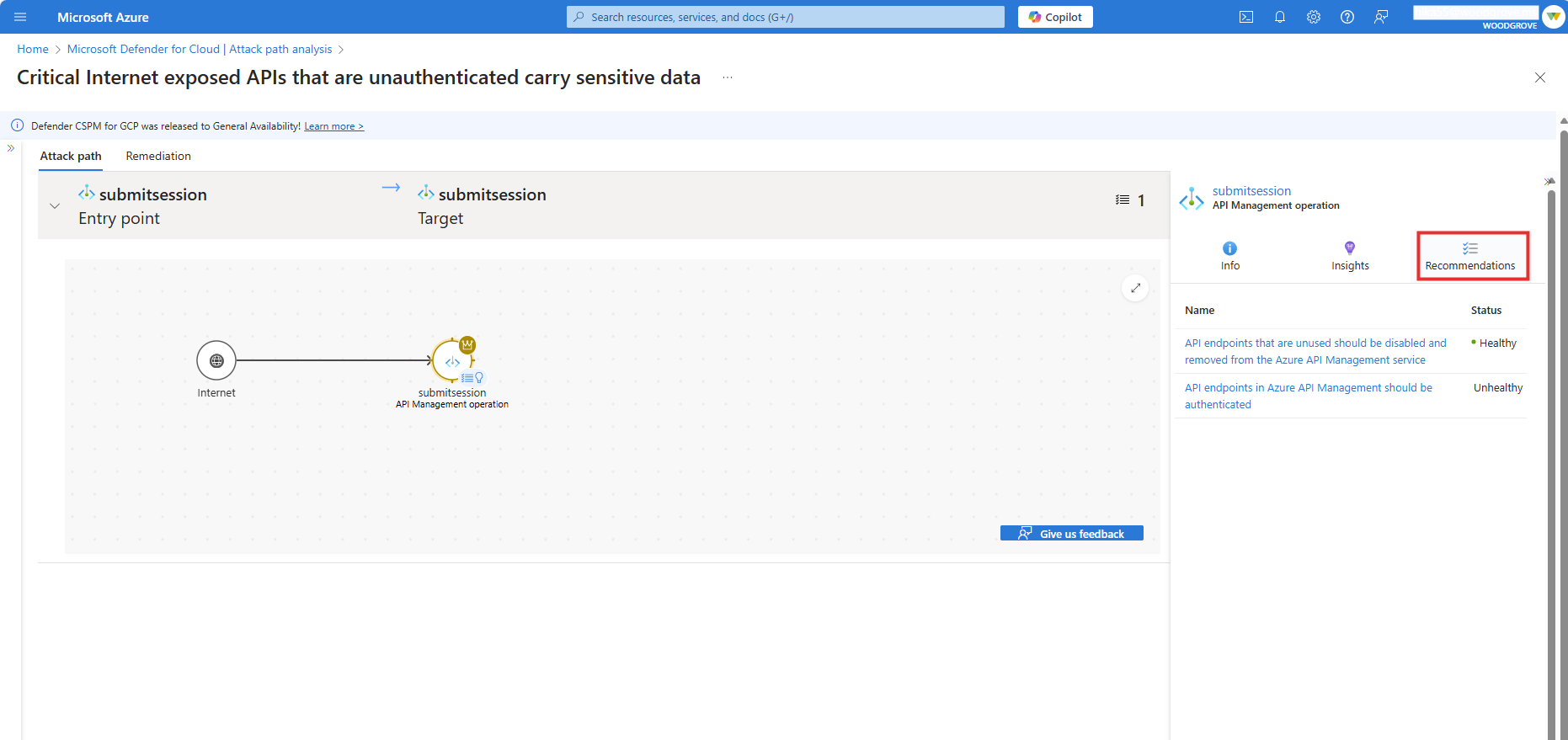 Zeigen Sie die Sicherheitsempfehlungen für Ihre API-Endpunkte im Geltungsbereich an, und wenden Sie die Empfehlungen an, um APIs mit Angriffsflächen mit einem hohen Risiko zu schützen.