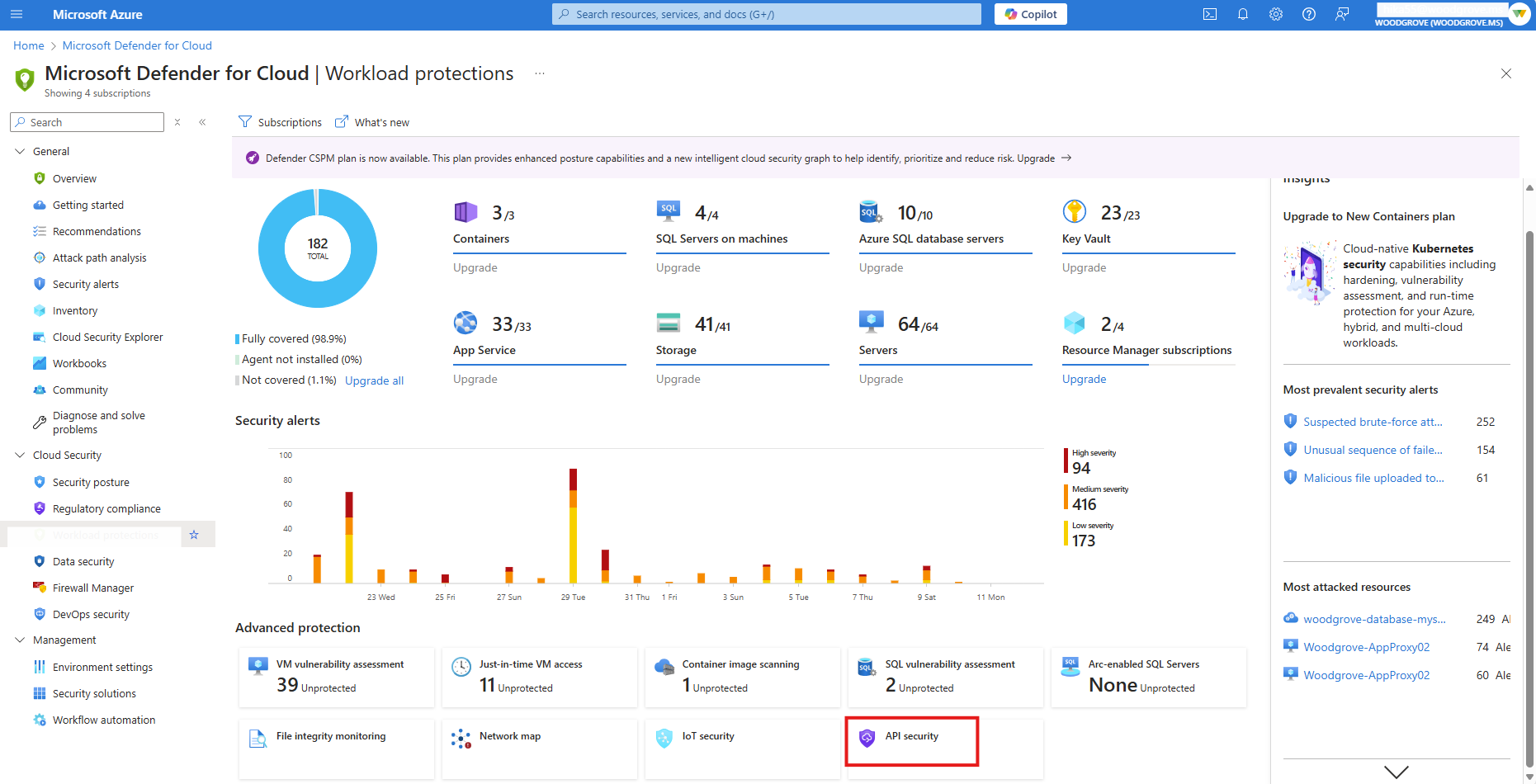 APIs, die in den Defender CSPM-Plan integriert sind, werden im API-Sicherheitsdashboard unter Workloadschutz und Microsoft Defender for Cloud Inventory angezeigt.