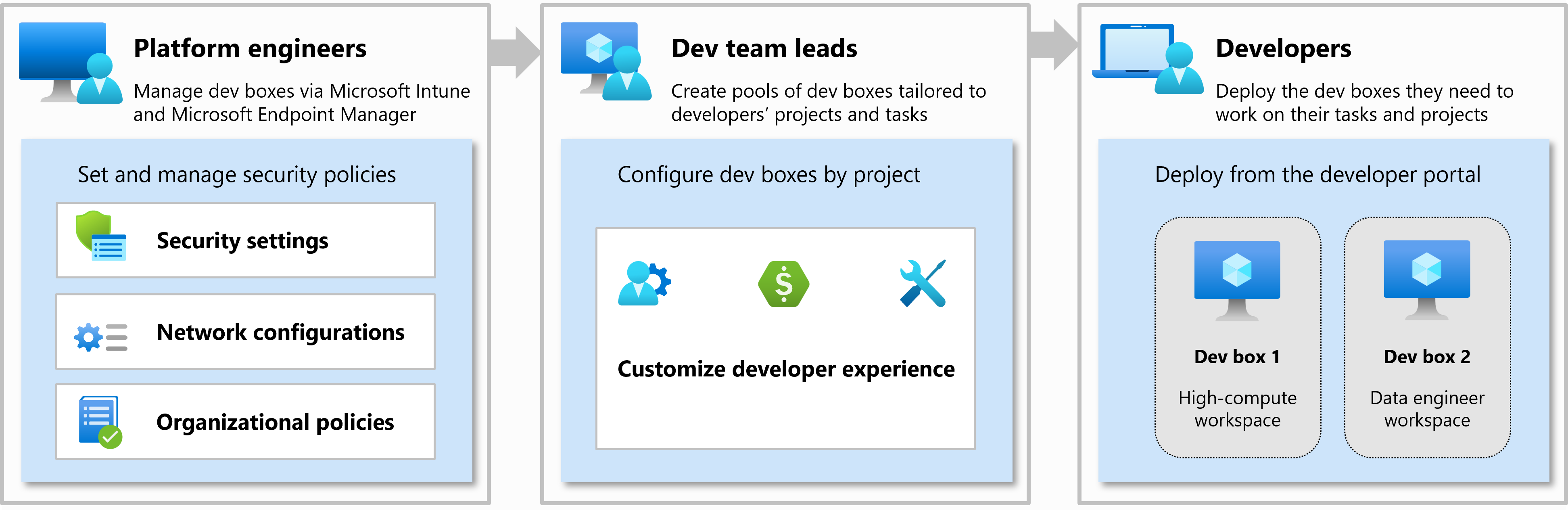 Jede dieser Rollen hat während der Bereitstellung von Microsoft Dev Box in Ihrer Organisation bestimmte Zuständigkeiten: