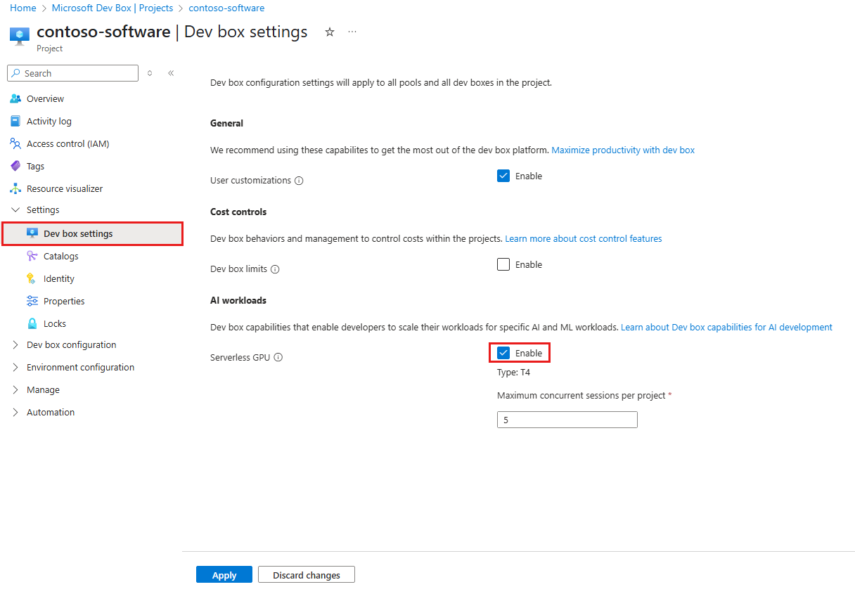 Der Zugriff auf serverlose GPU-Ressourcen wird über Eigenschaften auf Projektebene verwaltet. Wenn das Serverlose GPU-Feature für ein Projekt aktiviert ist, können alle Dev Boxes in diesem Projekt GPU-Compute verwenden. Dieses einfache Zugriffsmodell entfernt die Notwendigkeit benutzerdefinierter Rollen oder poolbasierter Konfigurationen.