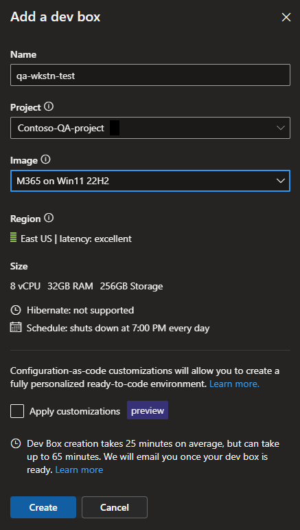 - Eine Benachrichtigung darüber, dass der Erstellungsprozess der Dev-Box 25 Minuten oder länger dauern kann.