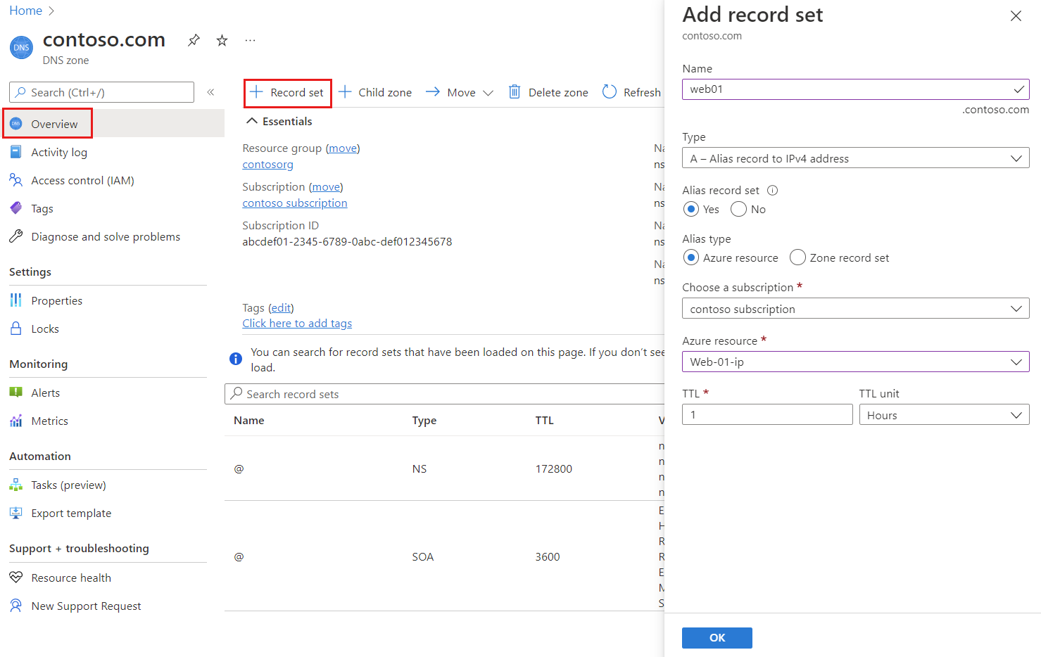 - Wählen Sie die DNS-Zone contoso.com aus.