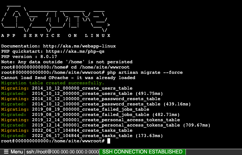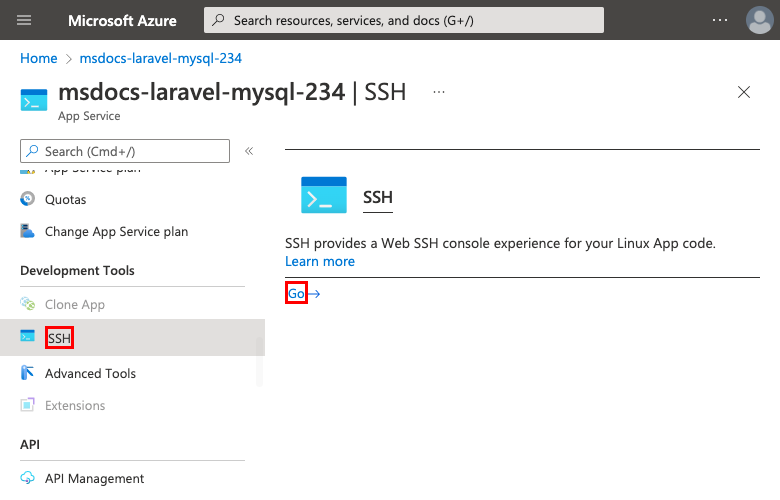 Der Erstellungs-Assistent platziert die Azure-Datenbank für MySQL Flexible Server-Instanz hinter einem privaten Endpunkt, sodass nur über das virtuelle Netzwerk darauf zugegriffen werden kann. Da die App Service-App bereits mit dem virtuellen Netzwerk integriert ist, ist die einfachste Möglichkeit, Datenbankmigrationen mit Ihrer Datenbank direkt im App Service-Container auszuführen.