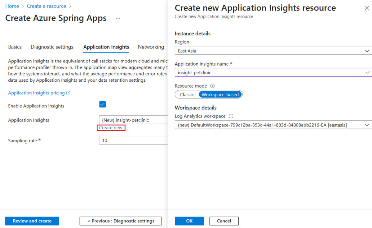 Navigieren Sie zur Registerkarte Application Insights auf der Seite Azure Spring Apps erstellen, und wählen Sie dann Neu erstellen aus, um eine neue Application Insights-Instanz zu erstellen. Aktualisieren Sie auf der Seite Neue Application Insights-Ressource erstellen den Application Insights-Namen nach Bedarf, wählen Sie Arbeitsbereich-basiert für Ressourcenmodus aus, und wählen Sie dann OK aus, um die Erstellung zu bestätigen.