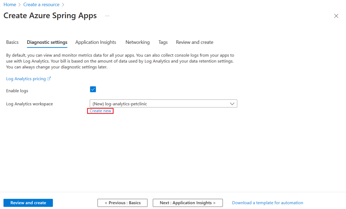 Navigieren Sie zur Registerkarte Diagnoseeinstellungen auf der Seite Azure Spring Apps erstellen, und wählen Sie dann Neu erstellen aus, um eine neue Log Analytics-Arbeitsbereichsinstanz zu erstellen. Aktualisieren Sie auf der Seite Neuen Log Analytics-Arbeitsbereich erstellen den Namen des Log Analytics-Arbeitsbereichs nach Bedarf, und wählen Sie dann OK aus, um die Erstellung zu bestätigen.