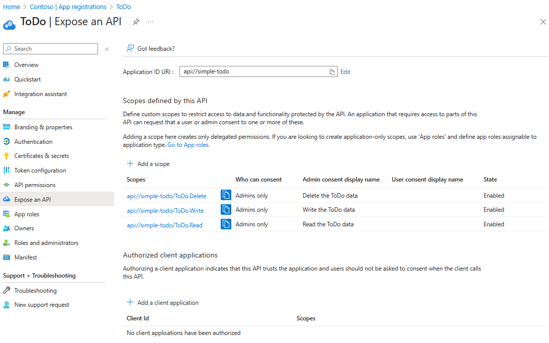 api://{client ID}), oder verwenden Sie anstelle der Client-ID einen aussagekräftigen Namen (etwaapi://simple-todo), und wählen Sie dann Speichern aus.Wählen Sie unter Verwalten die Option Eine API verfügbar machen>Bereich hinzufügen aus, und geben Sie dann die folgenden Informationen ein: