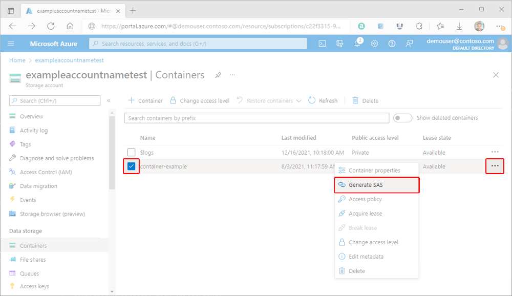 Wählen Sie die Schaltfläche "Mehr " (...) des Containers und dann "SAS generieren " aus, um den Bereich "SAS generieren " anzuzeigen.
