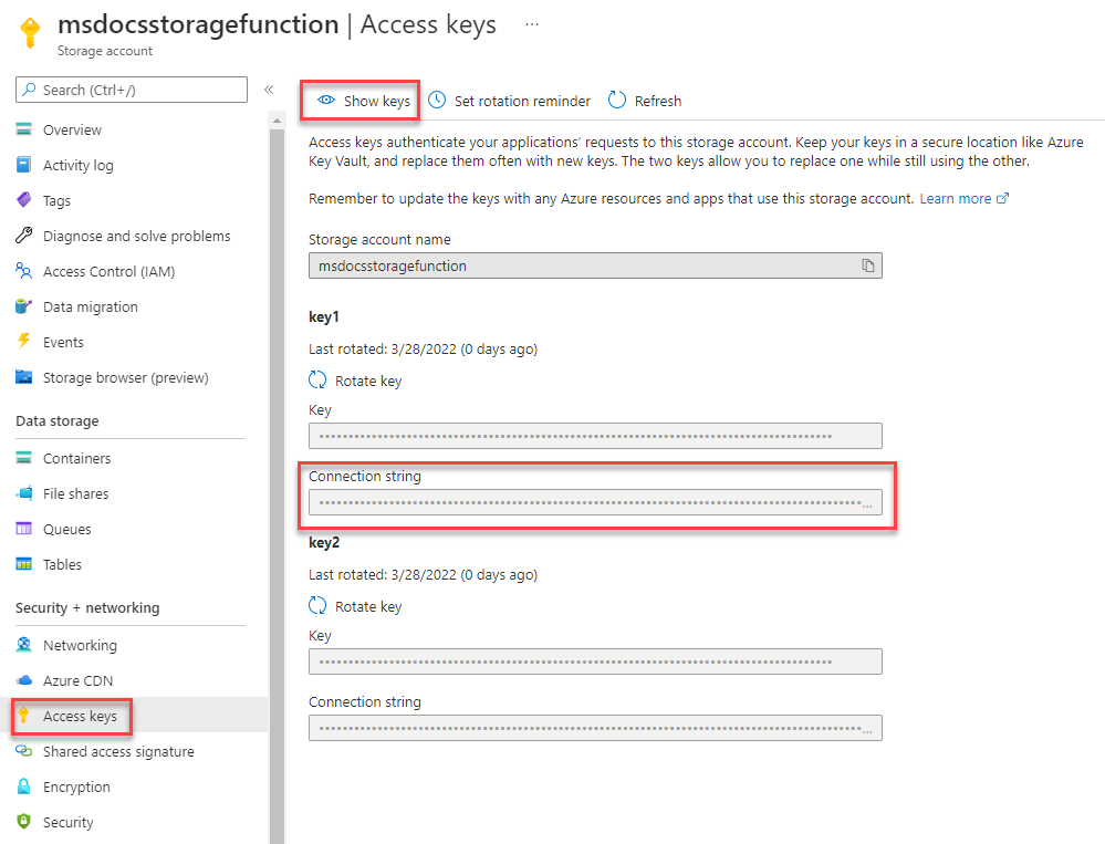 2. Wählen Sie auf der Seite Zugriffsschlüssel die Option Schlüssel anzeigen aus. Kopieren Sie den Wert der Verbindungszeichenfolge unter dem Abschnitt "key1 ", und fügen Sie den Schlüssel an einer beliebigen Stelle ein, die für später verwendet werden soll. Notieren Sie sich auch den Namen des Speicherkontos msdocsstoragefunction für später.