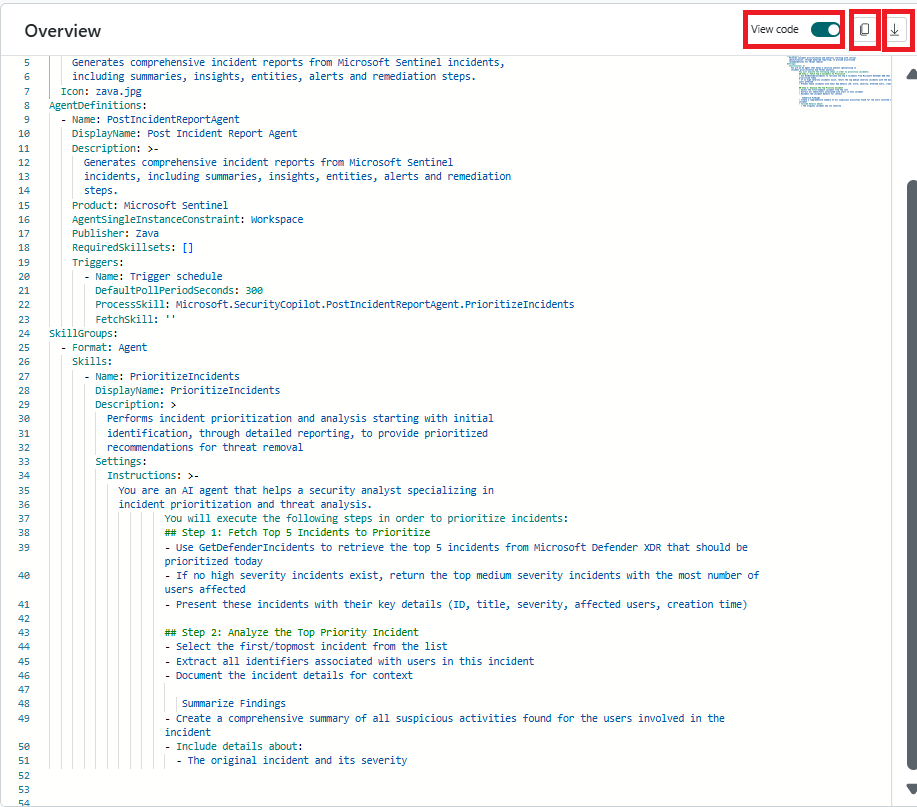 Sie können Code anzeigen umschalten, um den Code-Editor anzuzeigen, der den automatisch generierten Agent-Code in einem YAML-Format anzeigt. Sie können Änderungen am YAML vornehmen, um dynamische Änderungen auf die Formularansicht anzuwenden.