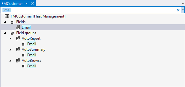 Sometimes, the node list for an element can be long, so that it's difficult to find the specific node that you're looking for. Notice that there is a search bar at the top of each element designer. You can enter a string to search for, and the node list will be filtered to include only the nodes that match the search string. For example, the following illustration shows the element designer for the FMCustomer table after the “Email” search term was applied. Only nodes that have names that match that search term appear in the element designer.
