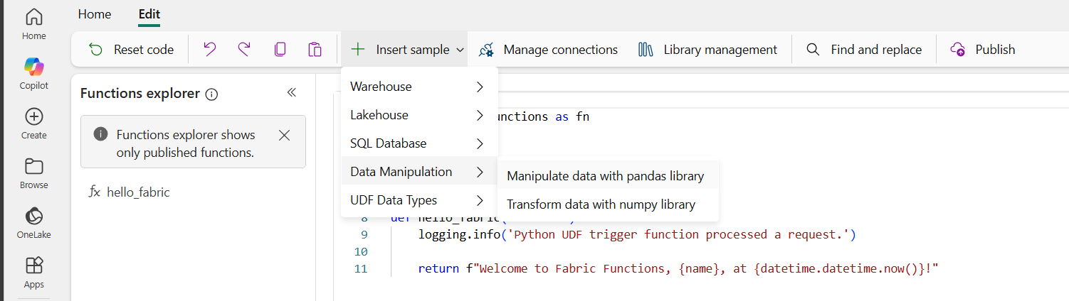 hello_fabric-Python-Funktionsvorlage zu erstellen. Im Funktions-Explorer werden alle Funktionen angezeigt, die veröffentlicht wurden und aufgerufen werden können.Nachdem die
