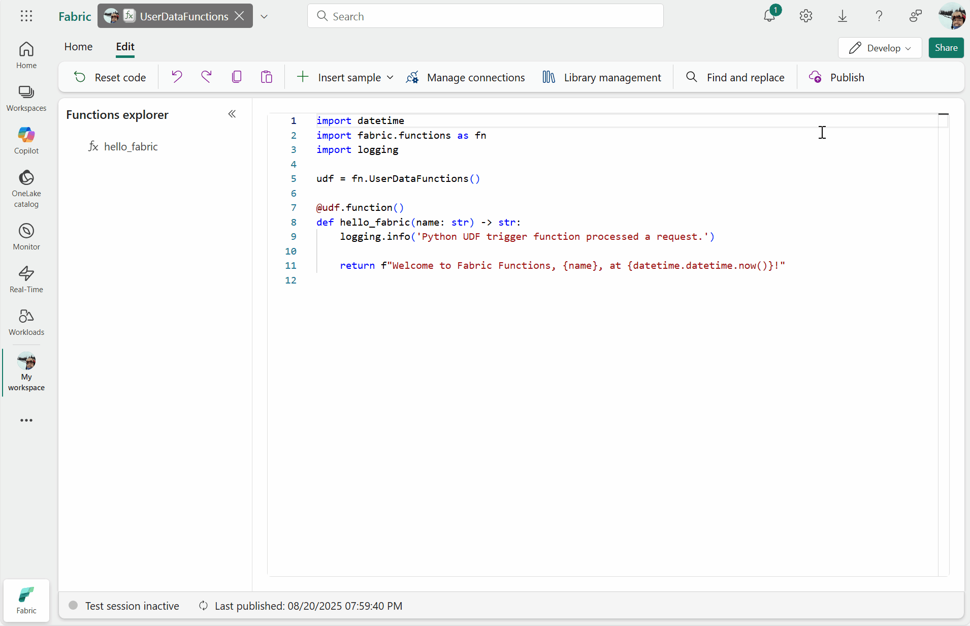 hello_fabricinhello_fabric1um:@udf.function() def hello_fabric1(name: str) -> str: logging.info('Python UDF trigger function processed a request.') return f"Welcome to Fabric Functions, {name}, at {datetime.datetime.now()}!"Nachdem Sie den Namen geändert haben, wählen Sie Veröffentlichen aus, um diese Änderungen zu speichern.