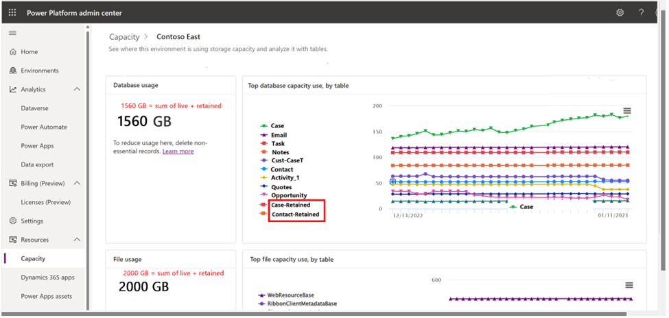 Stellen Sie sich ein nicht produktives Szenario vor, in dem alle Live-Daten für die Fall- und die Kontakttabellen mit einer Dataverse-Langzeitaufbewahrung aufbewahrt werden. Nachdem die Richtlinie zur langfristigen Aufbewahrung erfolgreich abgeschlossen wurde, finden sich im Bericht Einträge für Fall-aufbewahrt und Kontakt-aufbewahrt. Die Verringerung der verbrauchten Datenbankkapazität hängt von der Anzahl der Zeilen und der Typen der Spalten ab, die an der Speicherung beteiligt sind. In Produktionsumgebungen kann es einige Tage bis eine Woche dauern, bis die Berichte die gesamten Einsparungen widerspiegeln. In Nichtproduktionsumgebungen kann es bis zu zwei Wochen dauern, bis die Berichte die Einsparungen widerspiegeln.
