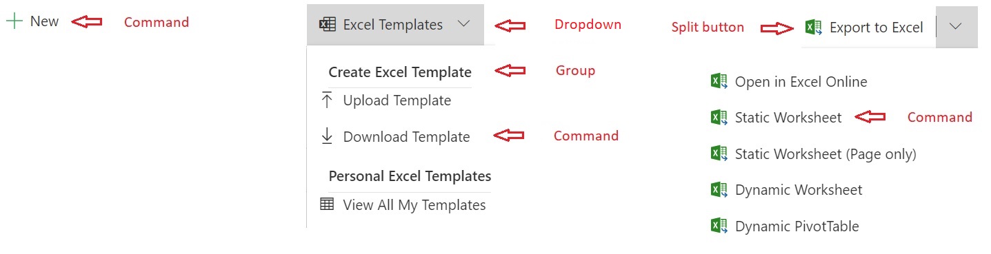 - Befehl Schaltfläche „Standard“. Führt bei Auswahl eine Aktion aus. Kann auch in Gruppen innerhalb von Dropdowns und geteilten Schaltflächen verschachtelt werden. Beachten Sie, dass diese in klassischen Befehlsfunktionen Flyouts genannt wurden.