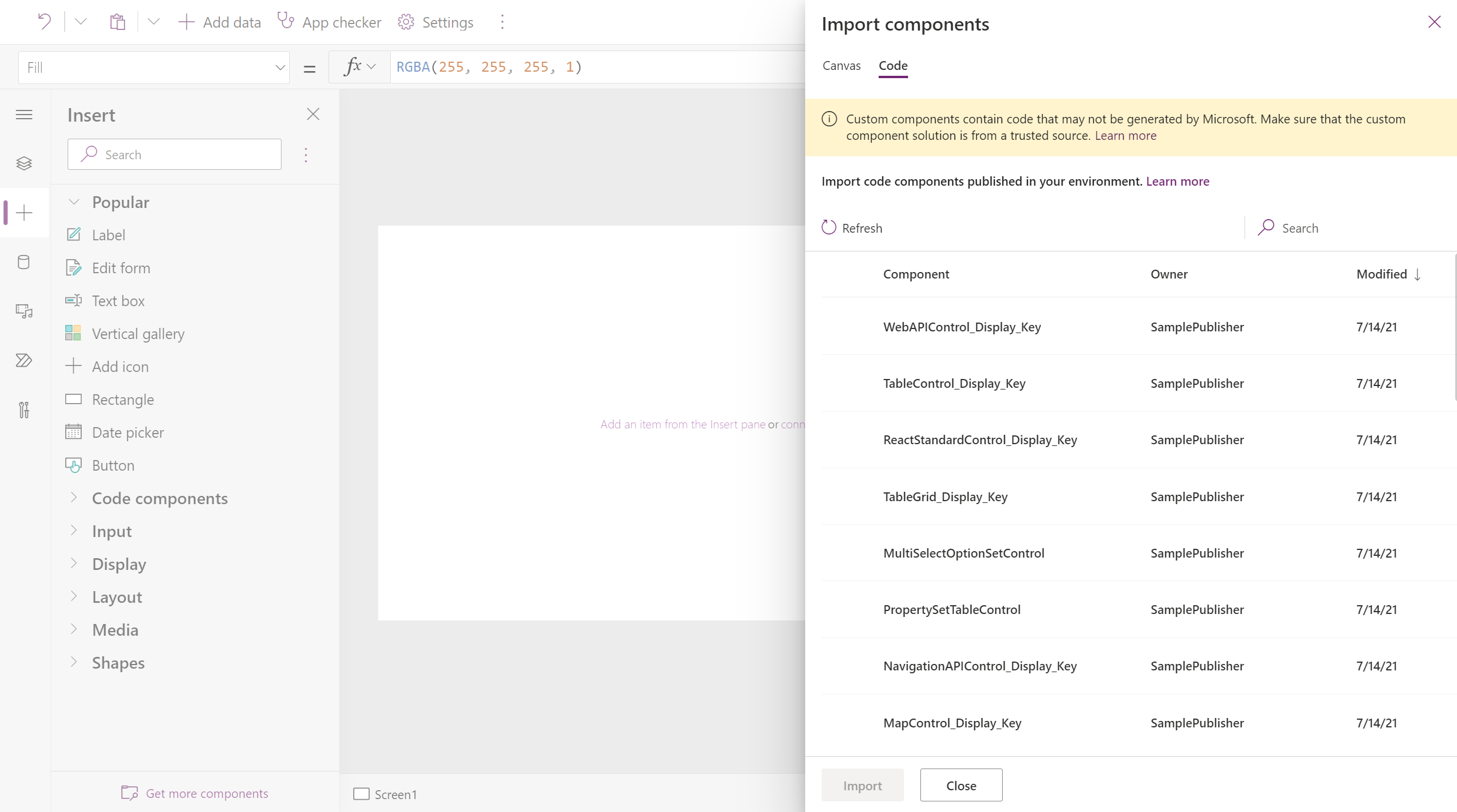 • Wenn die Code-Registerkarte nicht im Bereich Komponente importieren angezeigt wird, überprüfen Sie, ob das Power Apps component framework für Canvas-Apps aktiviert ist. Mehr Informationen: Aktivieren Sie die Power Apps componente framework Funktion