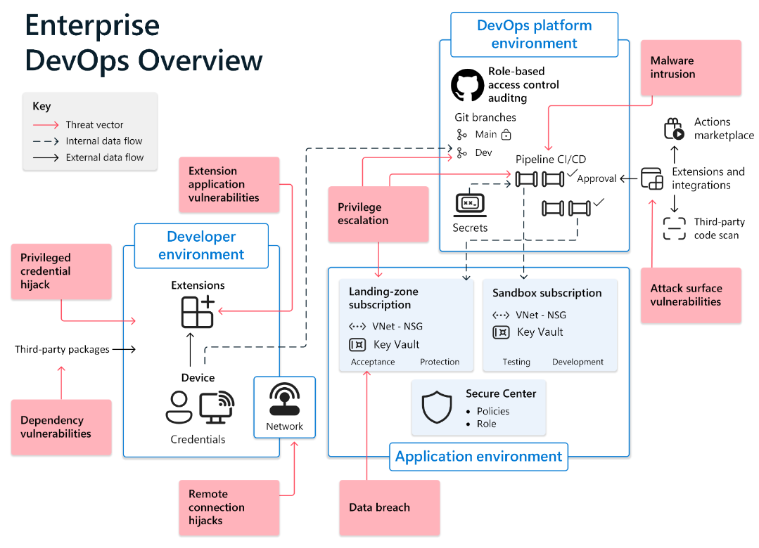 Beachten Sie im folgenden Diagramm, wie die Entwicklerumgebung eine Verbindung mit der DevOps-Toolsumgebung herstellt, um sich auf Git-Verzweigungen auszuwirken. Die Umgebungsoberfläche wird durch Verbindungen zu Open-Source-Paketen und Anwendungserweiterungen erweitert. Erweiterungen stellen Angriffsvektoren in Abhängigkeits- und Erweiterungsanwendungsrisiken dar.