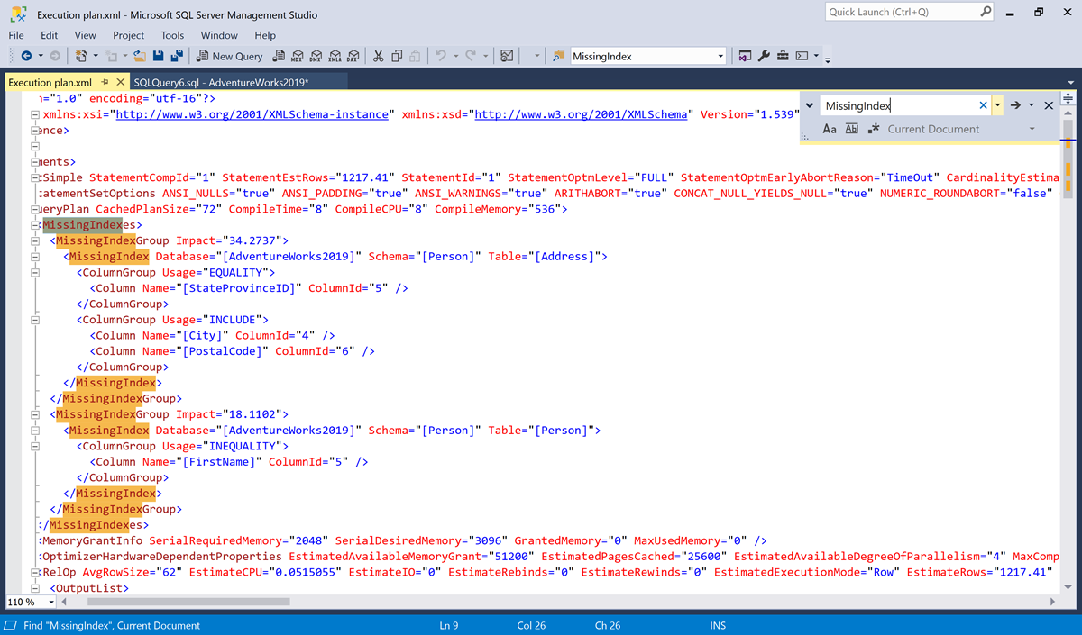 Screenshot des XML-Codes für einen Ausführungsplan. Das Dialogfeld „Suchen“ wurde geöffnet, und der Begriff „MissingIndex“ wurde im Dokument gesucht.