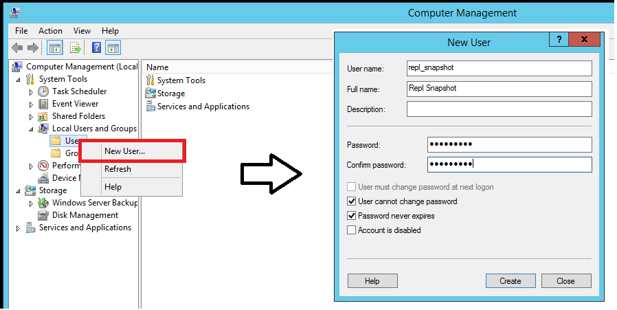Geben Sie repl_snapshot im Feld Benutzername ein, geben Sie das Kennwort und weitere relevante Informationen an, und klicken Sie anschließend auf Erstellen, um das Konto „repl_snapshot“ zu erstellen:
