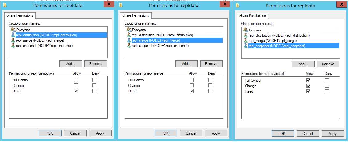 Klicken Sie nach der ordnungsgemäßen Konfiguration der Freigabeberechtigungen auf OK, um das Dialogfeld Permissions for repldata (Berechtigungen für „repldata“) zu schließen. Klicken Sie auf OK, um das Dialogfeld Erweiterte Freigabe zu schließen.