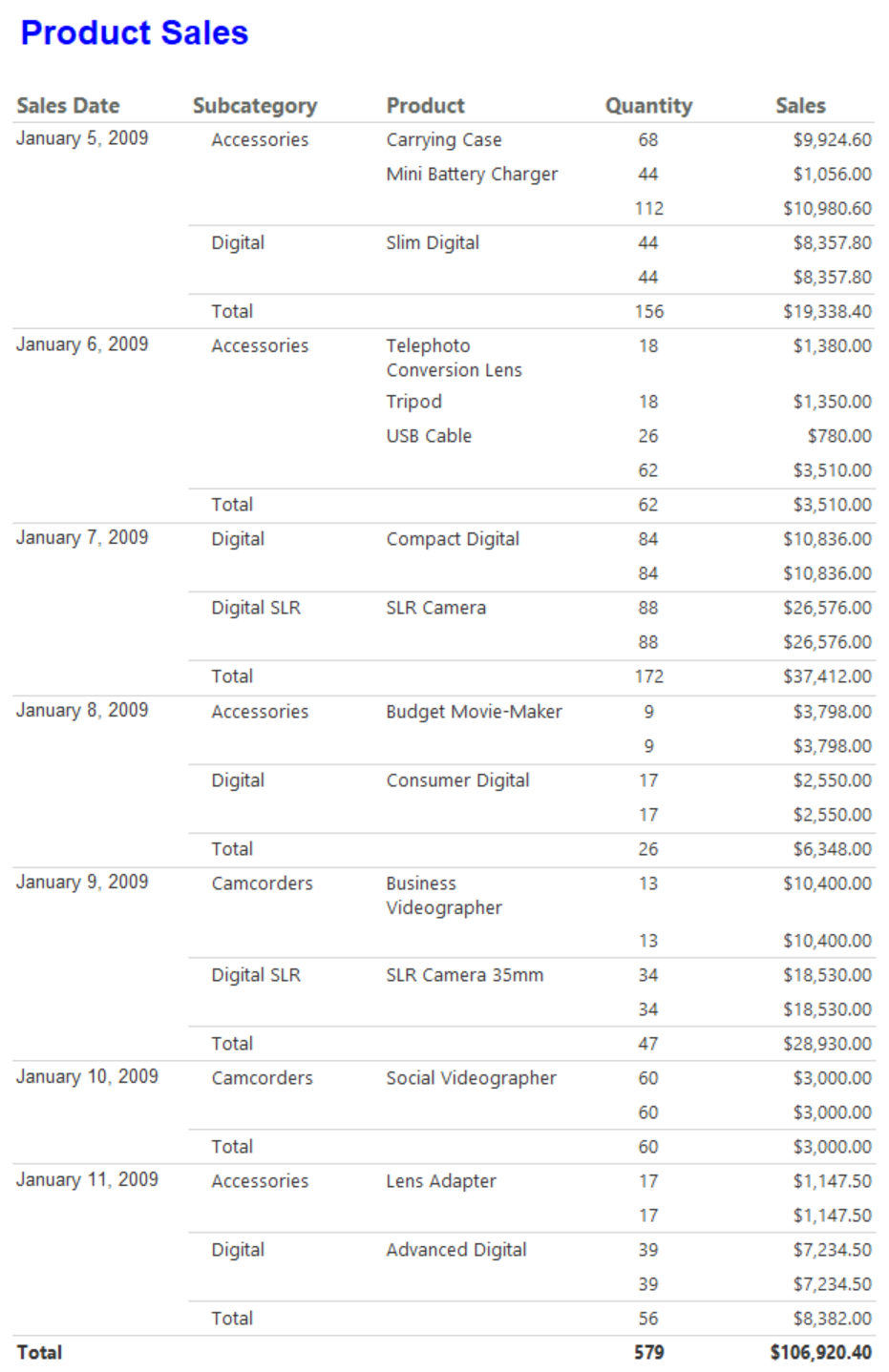 Bestätigen Sie, dass die Werte in der Spalte „SalesDate“ nur als Datumsangaben (Monat, Tag, Jahr) angezeigt werden. Hier ist ein Beispiel aus dem Bericht: